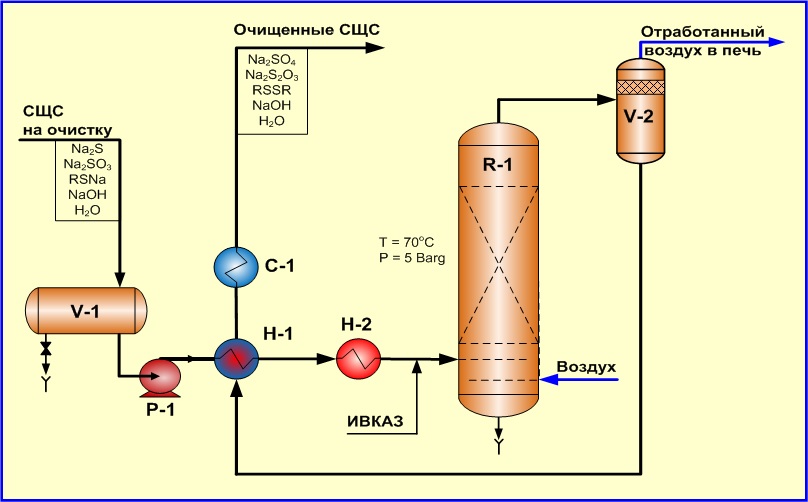 C верха R-1 очищенные сточные воды с воздухом направляются в сепаратор воздуха V-2. С верха V-2 отработанный воздух направляется в ближайшую печь на прокалку, а очищенные стоки после охлаждения в холодильнике С-1 до 40–50оС – на биоочистные сооружения. Процесс обеспечивает степень окисления сульфидной и меркаптидной серы до 99.9 %.