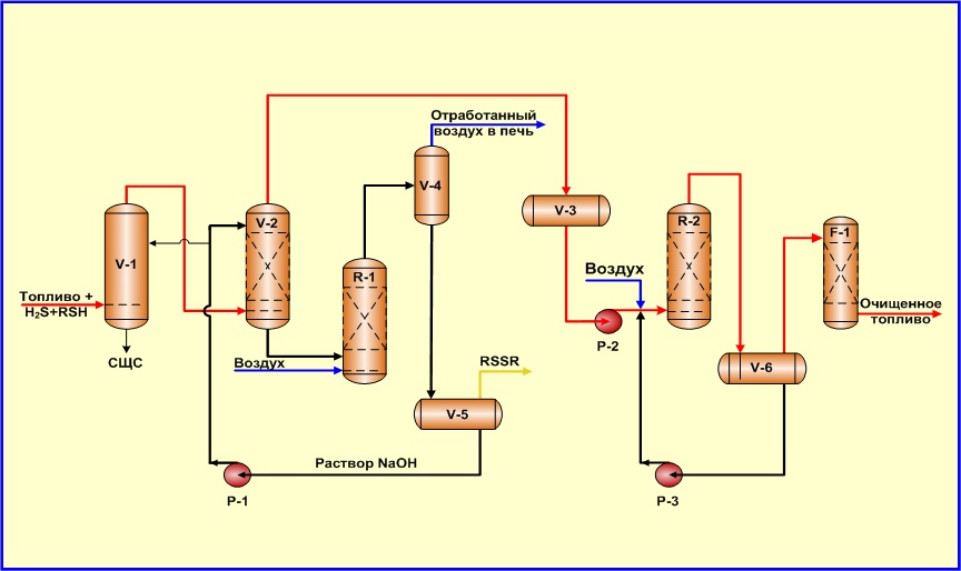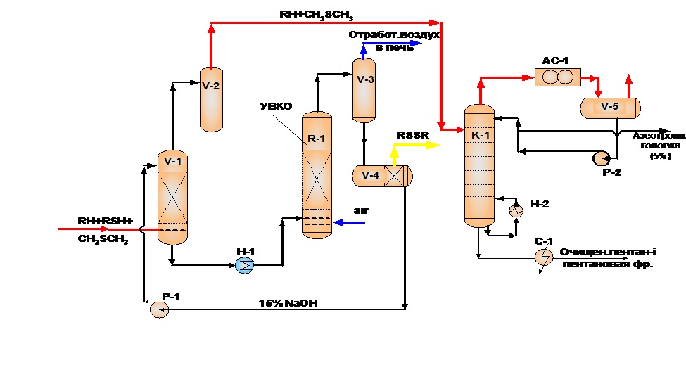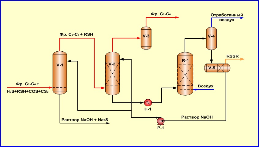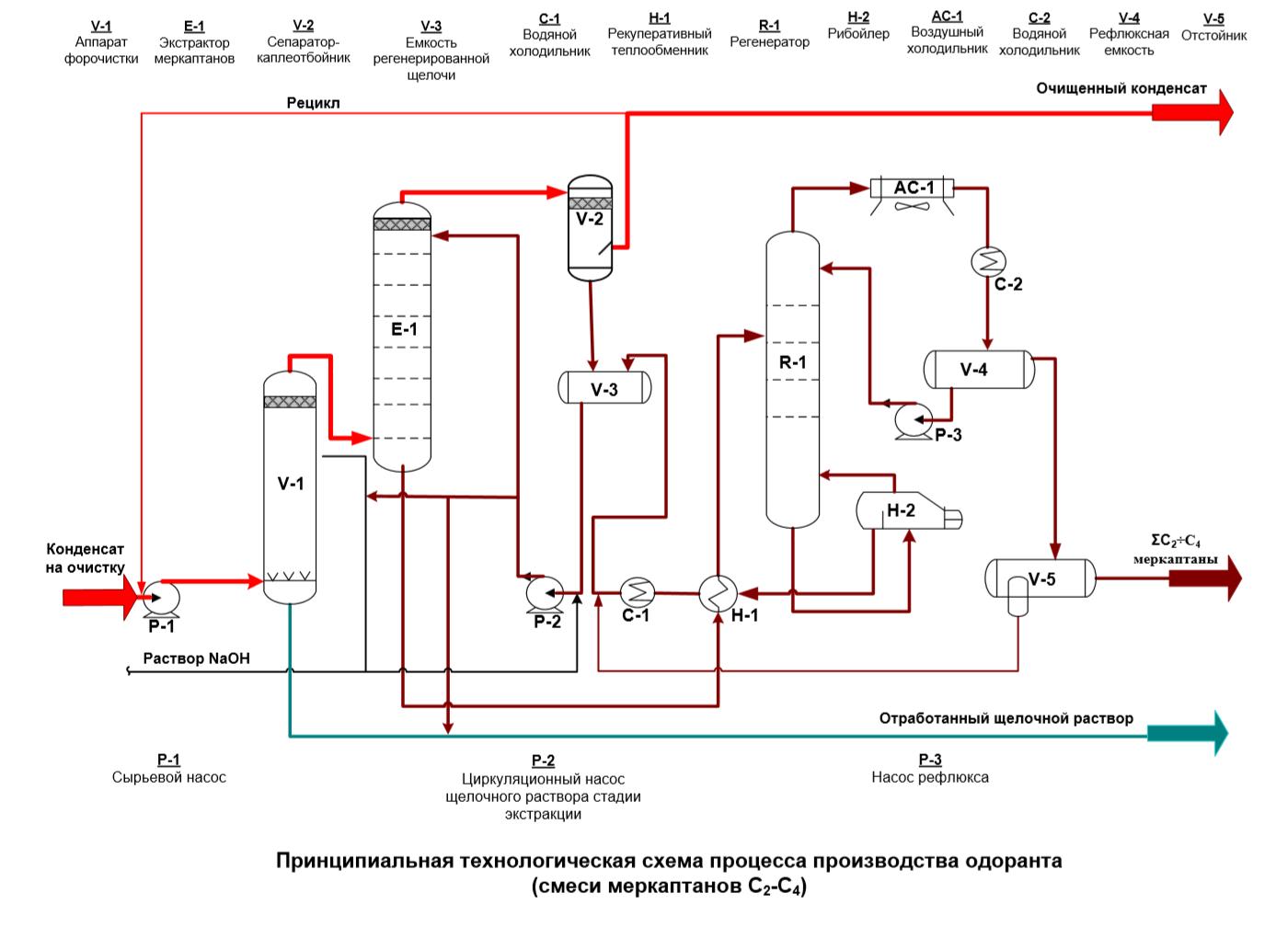 для очистки сернистых газоконденсатов и бензинов от сероводорода и низкомолекулярных меркаптанов С1-С4 с выделением смеси природных меркаптанов С2-С4 (СПМ) в качестве одоранта для природных газов.